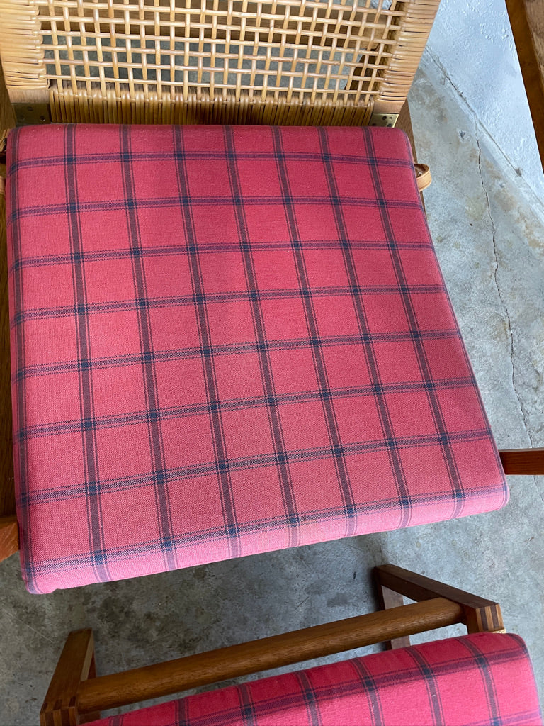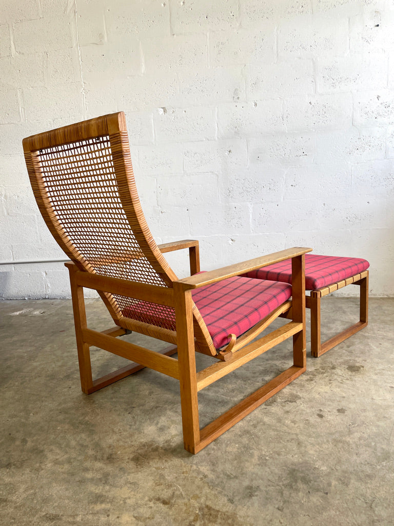 Lounge chair + Ottoman model BM-2254 designed by Børge Mogensen for Fredericia Stolefabrik, 1960s. This chair is adjustable in two different positions. Oak frame. Original fabric. 26w 32d 37h 14.5s Ottoman: 19w 19d 14.5s