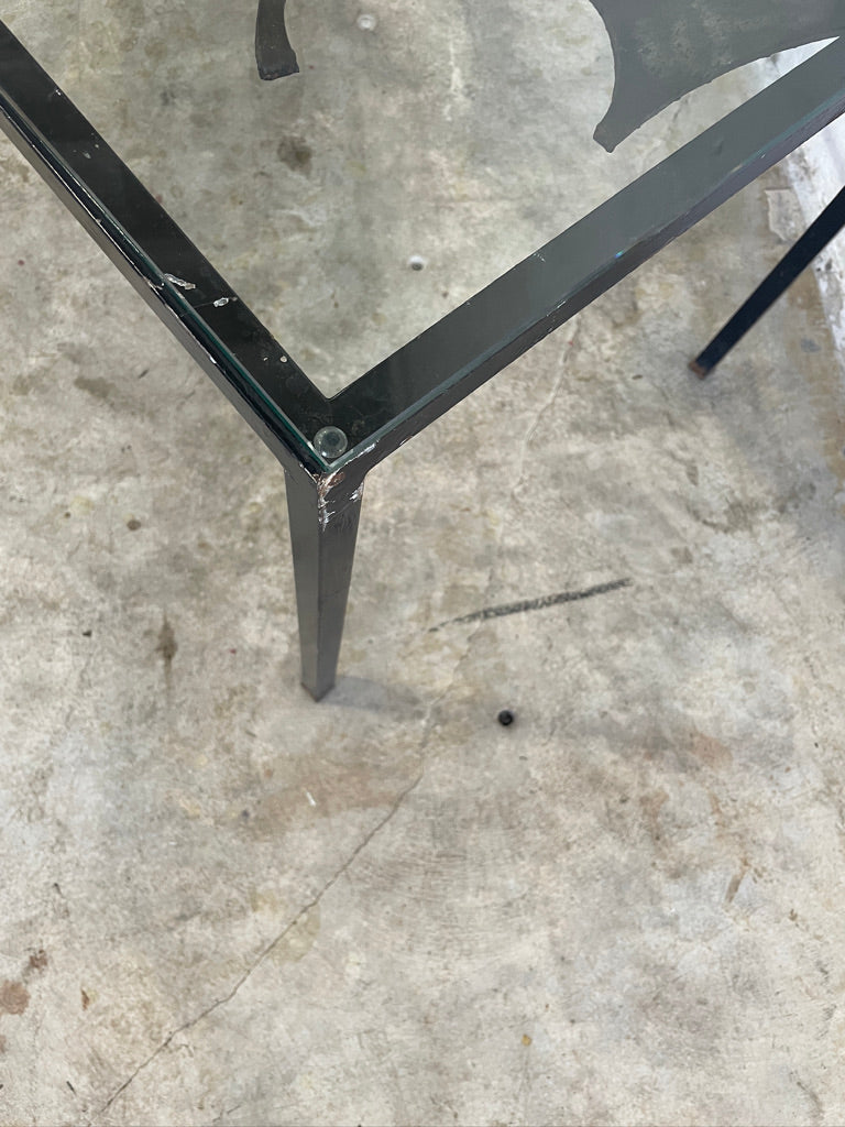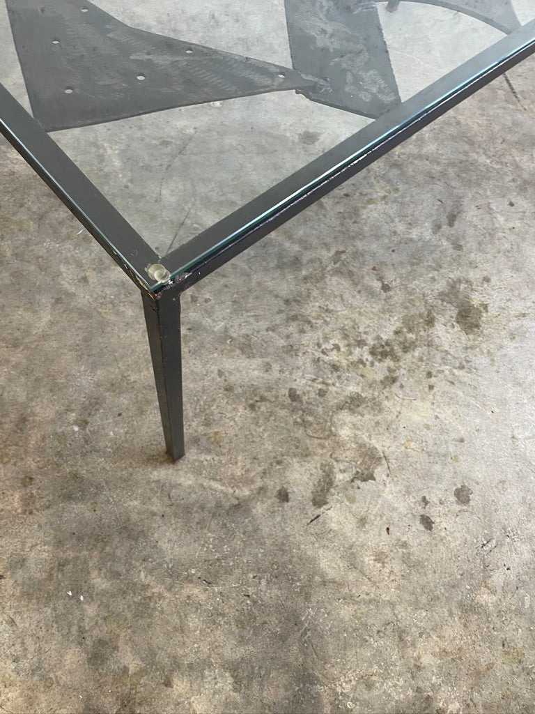 Mid Century Brutalist Coffee or Console Table with glass top. 43.5w 22d 21h