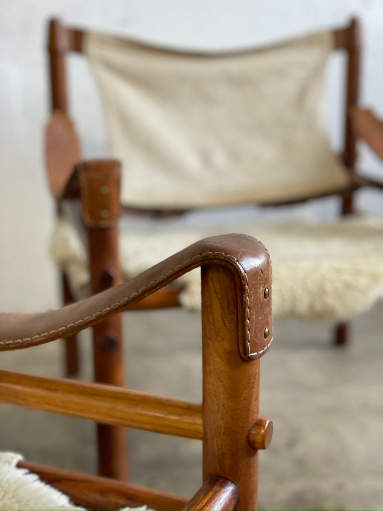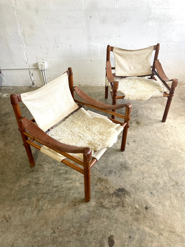 Pair of Arne Norell Sirocco Armchairs. Original canvas. Made in Sweden. Sheepskin throws included. Inspired by safari expeditions and campaign furniture in the 60s. 27w 25.5d 28h 14.5s